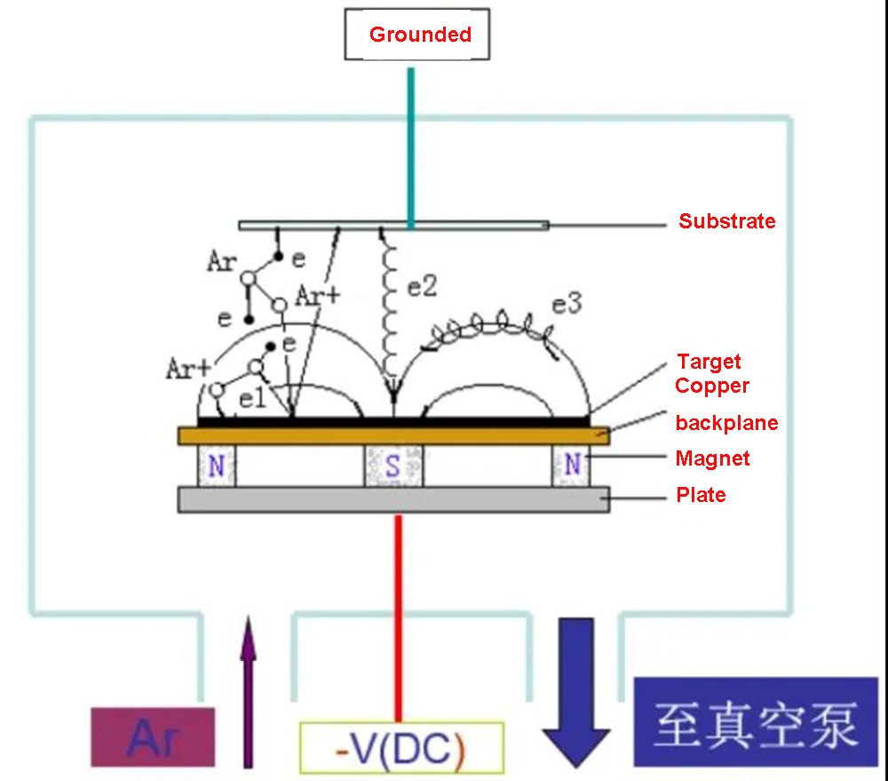 El principio de la pulverización catódica es bombardear la superficie del objetivo con partículas de alta energía, bombardear átomos o moléculas en la superficie del objetivo y golpear el sustrato bajo el control de un campo magnético y un campo eléctrico para depositar una película delgada. La pulverización catódica con magnetrón es un tipo de deposición física de vapor (PVD), que se usa ampliamente para preparar películas delgadas de diversos materiales, como metales, semiconductores y aislantes. Este método es simple de operar, fácil de controlar y tiene las ventajas de una fuerte adhesión y una gran área de recubrimiento. Desde su primer desarrollo en la década de 1970, la tecnología de pulverización catódica con magnetrones se ha aplicado gradualmente a aplicaciones industriales en los campos de la decoración, los semiconductores y la fabricación. En la actualidad, la pulverización catódica con magnetrones se ha convertido en una de las tecnologías más utilizadas y en evolución en el campo de la deposición al vacío. En comparación con otras tecnologías de pulverización catódica, la pulverización catódica con magnetrón no solo puede funcionar a una presión más baja y una tasa de deposición relativamente alta, sino que también se puede utilizar para sintetizar películas densas con menos granulosidad.